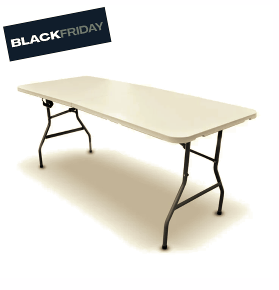 Disfruta de esta práctica mesa plegable de plástico blanca, ideal para disfrutar de agradables momentos con amigos o en familia.